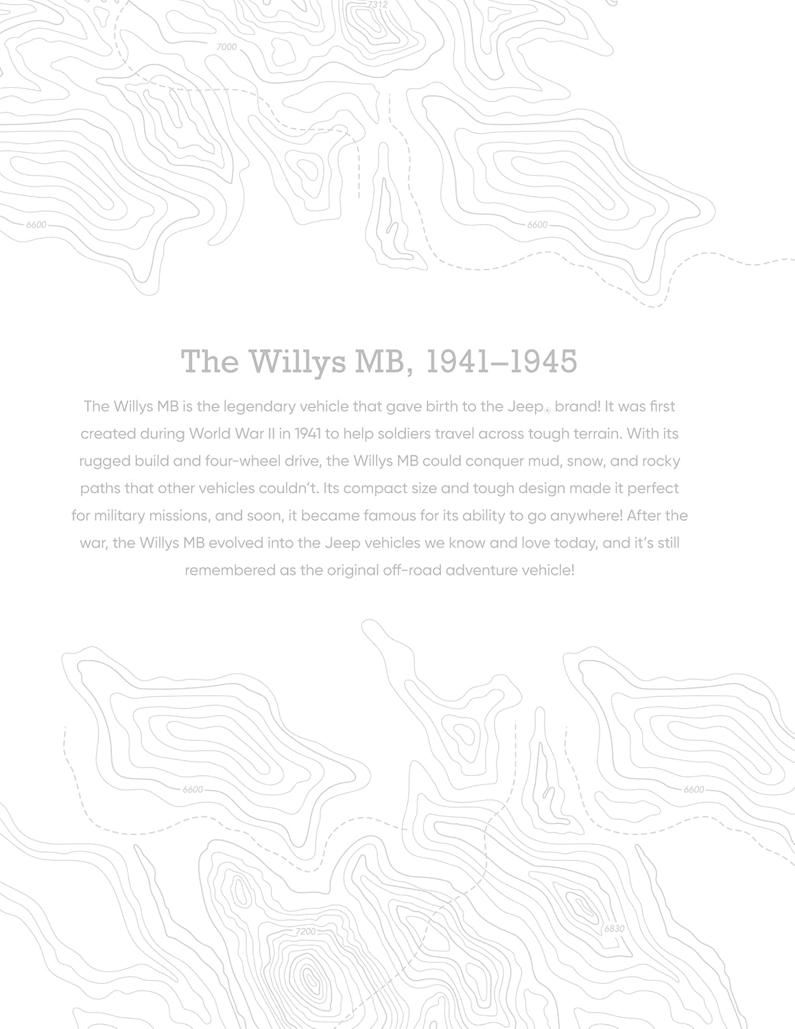 Also included is a fascinating timeline of the Jeep brand history, showcasing the incredible journey from their military origins to their status as an off-road icon. Learn fun facts and discover what makes these rugged vehicles so special, from their unmatched 4x4 capabilities to their enduring popularity among adventure seekers.