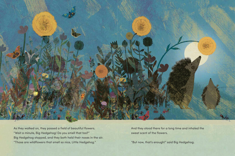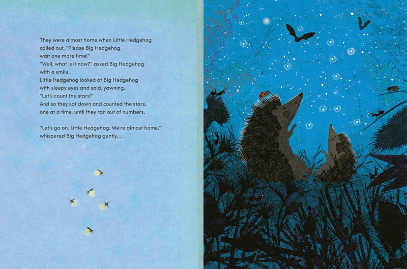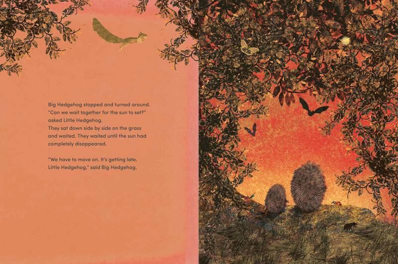 The little hedgehog’s answers unfold in a series of lush landscapes as the two animals wait for the sun to set, for birds to fly by, for the moon and stars to appear, and for the world around them to prepare for sleep.