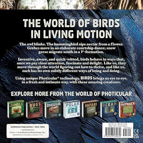 Seeing is believing with the innovative and bestselling Photicular books, and now Birds gives readers a fascinating, up close look at bird behavior in living motion. The book features eight incredible moving images: Penguins hopping, Grebes in an elaborate courtship dance, preening lovebirds, the blinking eyes of an owl, geese migrating in V formation, a hummingbird sipping nectar from a flower and a mother songbird feeding it's new hatchlings. The opening essay focuses on the incredible of birds and bird behaviors-the weird, the surprising-and birds' incredible ability to learn new behaviors. And the profile accompanying each animal image includes information on each species. It's an aviary that you can hold in your hands!