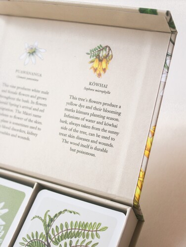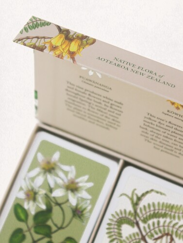 The back of the cards display paintings of the Kowhai and Clematis flowers.