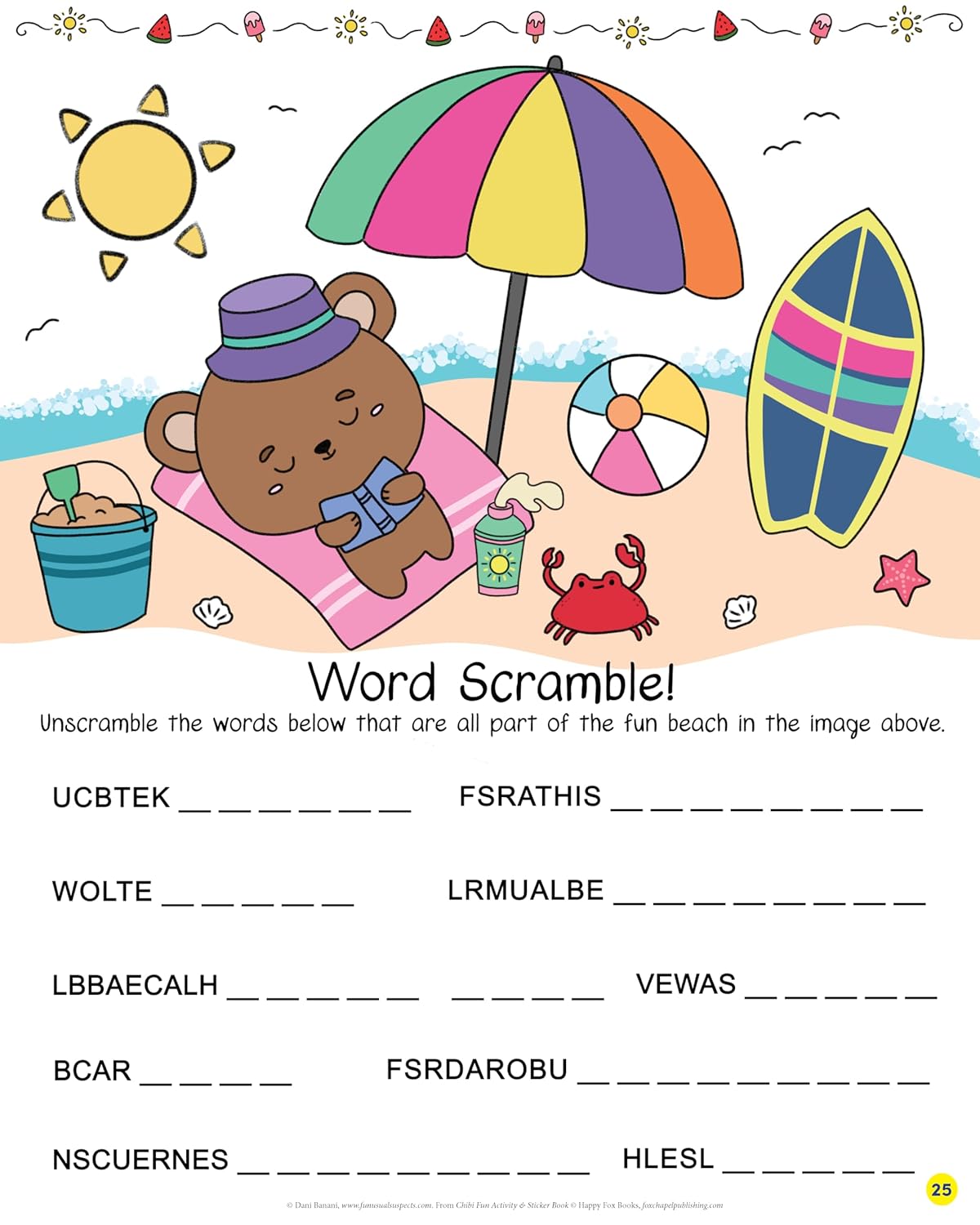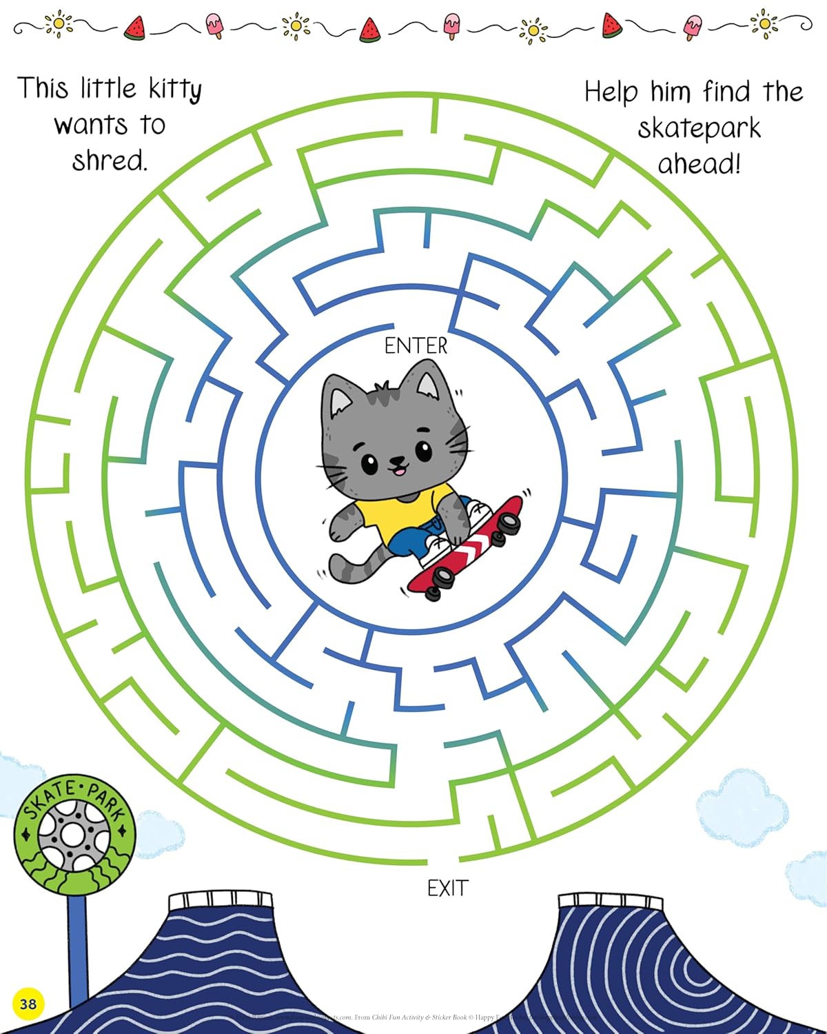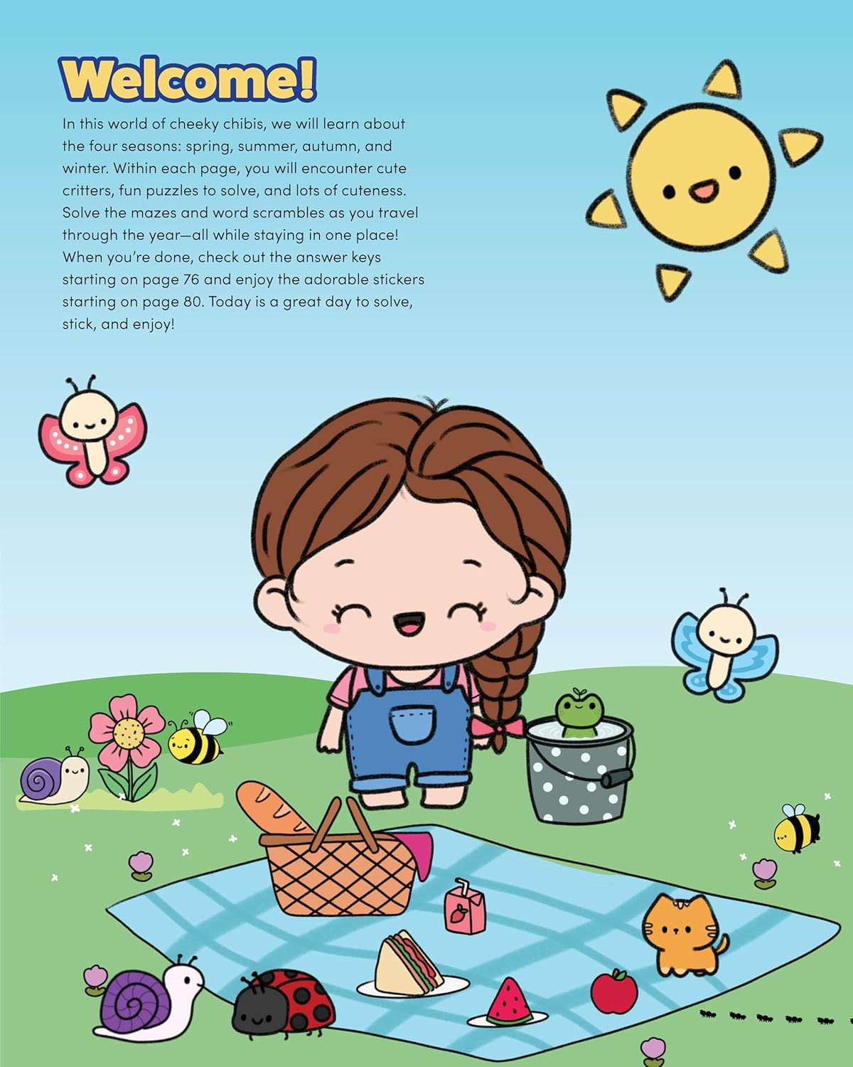 Inside Chibi Activity Fun, adorable chibi characters guide kids through a variety of entertaining and engaging activities including games, puzzles, riddles, mazes, coloring pages, spot-the-difference, search-and-find, and more!
