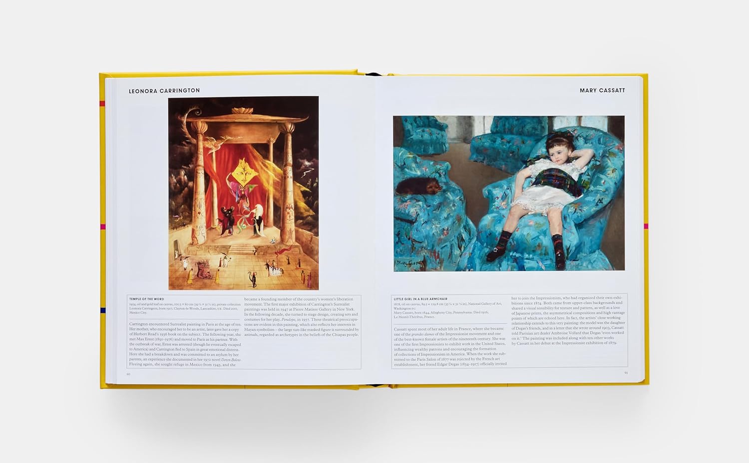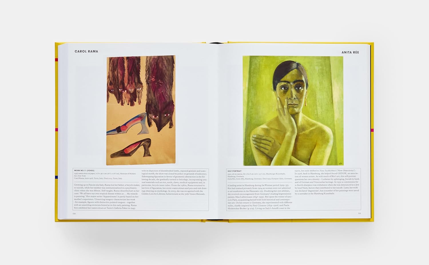 Organized alphabetically, the book features more than 400 artists from 50 countries around the world, representing each with a beautifully reproduced full-page artwork and a short illuminating text about its creator. Readers will find works by iconic and influential artists, such as Artemisia Gentileschi, Mary Cassatt, Georgia O’Keeffe, Frida Kahlo, Agnes Martin, Louise Bourgeois, Yayoi Kusama, and Cindy Sherman, as well as lesser-known names equally deserving of attention.