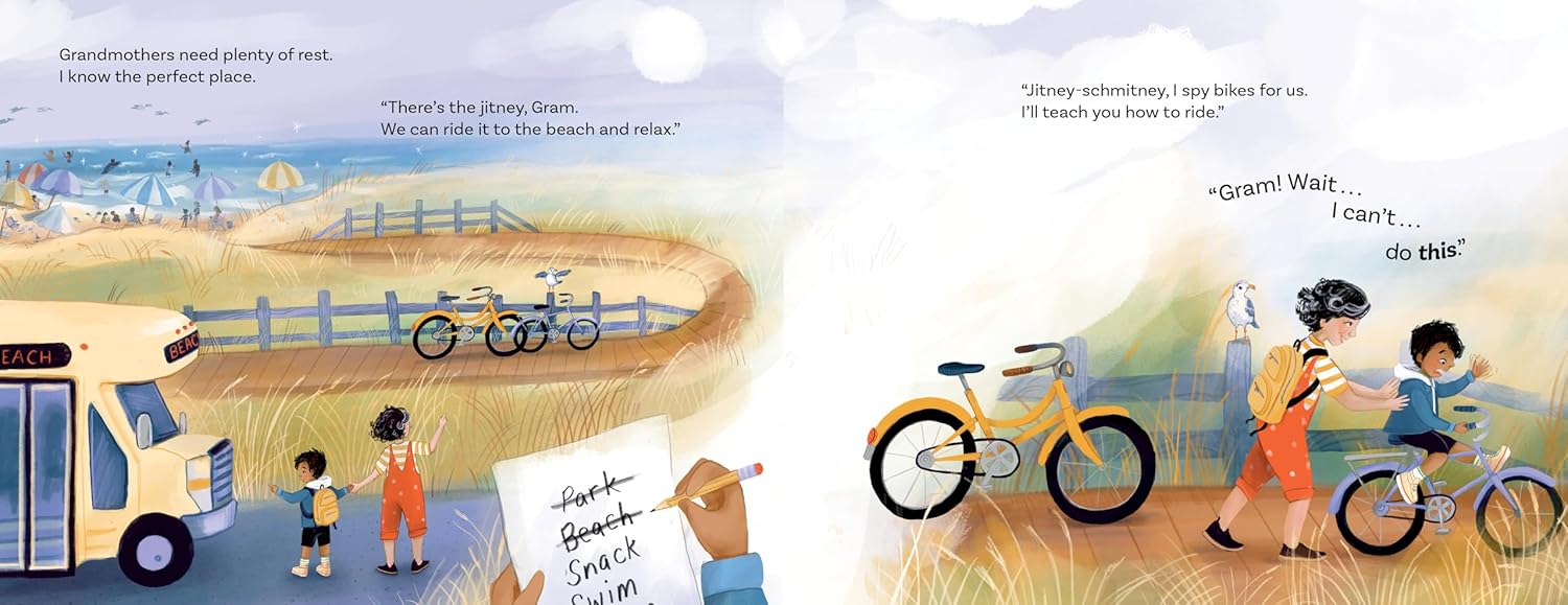 Encourages sharing outdoor activities and learning new skills: Mateo and Gram run in the park, ride bikes, swim in the ocean, and read together.