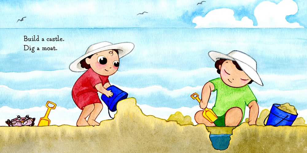 Two young children discover the delights of a day at the beach, as they splash in the waves, observe marine life, and play in the sand.