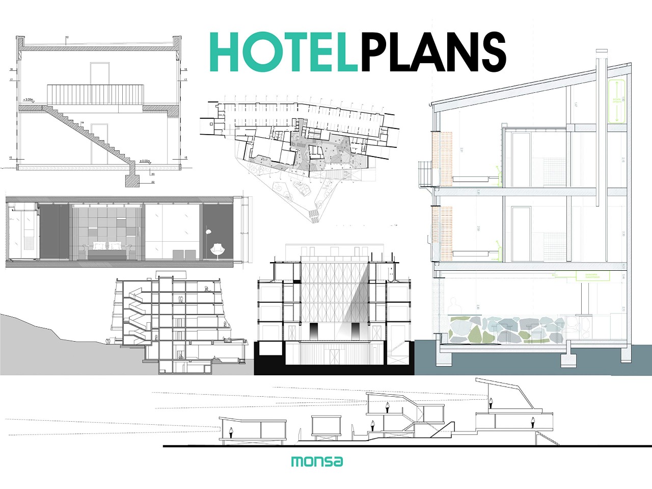 Hotel Plans contains more than 300 floor and elevations plans, as well as constructive details of 35 hotels projects from around the world, selected for being singular and unique hotels, both by their architecture and their interior design, that run away from the typical concept of standard hotel and are conceived for travellers looking for a different and unforgettable place to lodge.