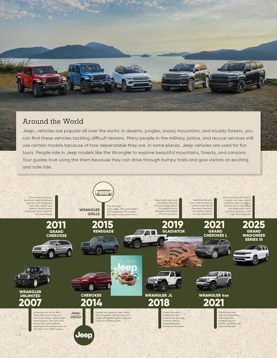 Also included is a detailed Jeep brand history timeline, where you can learn about the evolution from the classic Willys MB to today's top-of-the-line off-road machines. Learn fun Jeep facts and discover what makes these rugged vehicles so special, from their unmatched 4x4 capabilities to their enduring popularity among adventure seekers.