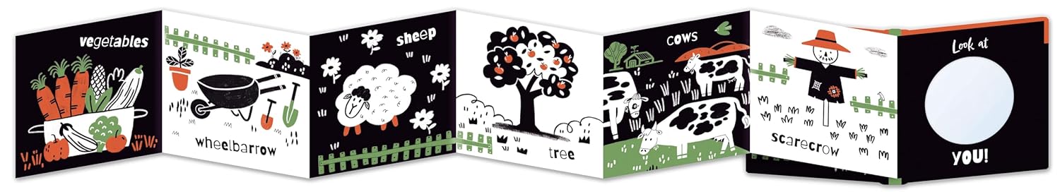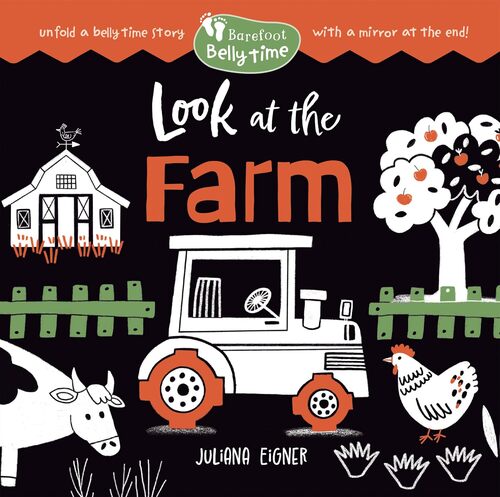 Get ready for a farmyard adventure with the interactive Barefoot Belly Time format! Look at the cows! Look at the tractors! There are so many things to see and explore in the busy farmyard. High-contrast illustrations in this sturdy format are a delight for babies’ developing eyes, keeping them engaged for tummy time fun. Plus, unfold the double-sided accordion pages to find a mirror at the end!
