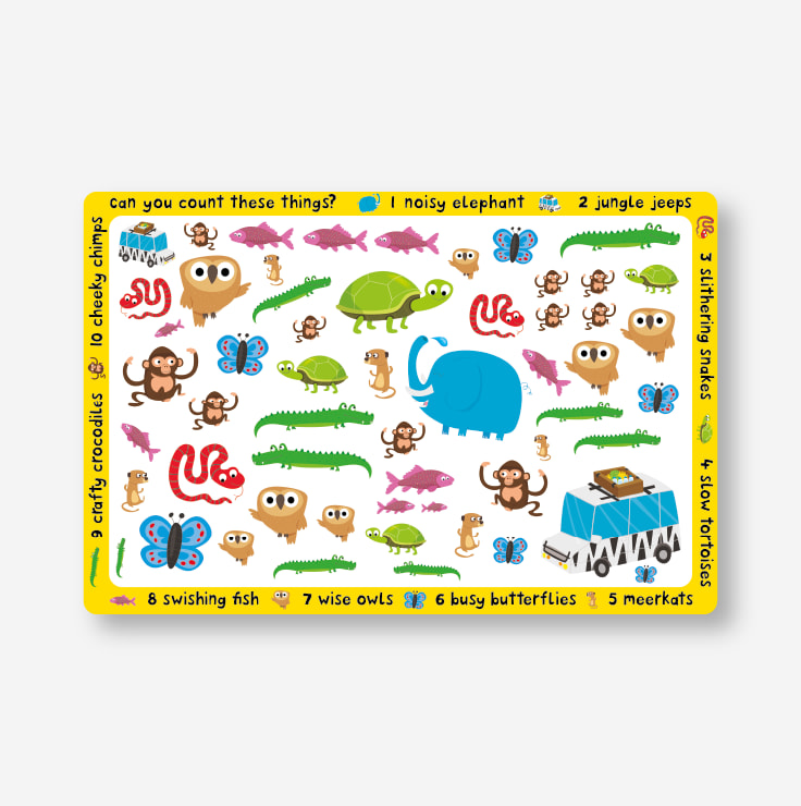 Jumbo format board book for your little one to get lost in. Packed with first words and an introduction to animals around the world. Counting and spotting spread to build numeracy understanding.