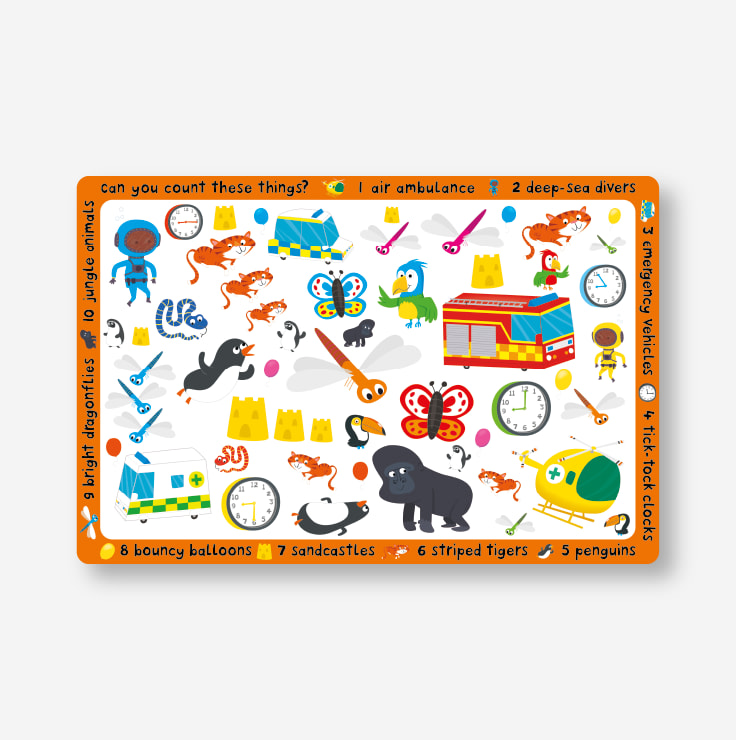 Jumbo format board book for your little one to get lost in. Packed with first words and early-learning concepts. Counting and spotting final spread to build numeracy understanding.