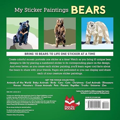 Also included are fun facts to learn more about each amazing ursine creature as kids bring them to life! An entertaining, hands-on activity for children, this sticker painting book offers an excellent opportunity for developing their focus and attention span. Designs are printed on thick, perforated pages that can easily detach to be framed, displayed on the fridge, or given as a gift once a painting is completed.