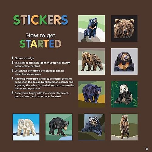 This distinctive poly-art paint-by-sticker book for kids ages 6-10 features a collection of 10 geometric designs of majestic bears, from huge Kodiak bears to the comparatively tiny sun bear! Using lots of colored stickers for each bear pattern, kids will place each in the appropriate spot according to its numbered section and watch as the geometric shapes transform into beautiful, crystalized animals.