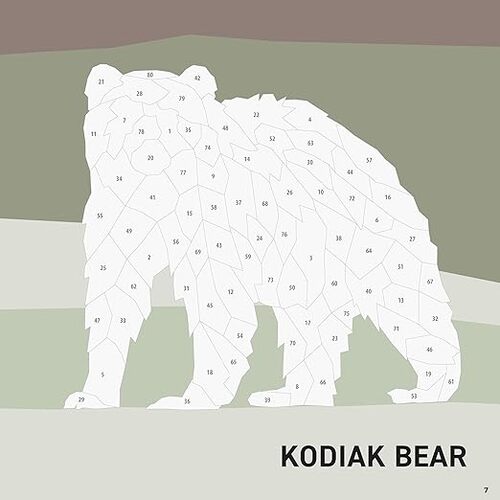 10 portraits of bears, from a panda bear to a spectacled bear, Kodiak bear, and more, made with numbered geometric sections that correspond with colored stickers