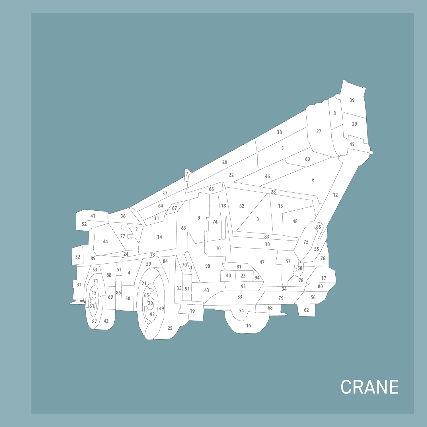 10 portraits of trucks including a rock truck, monster truck, cement mixer, and more, with numbered geometric sections that correspond with vibrant stickers
