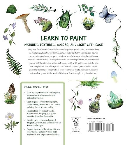 Painting the Secrets of the Forest with Watercolors is a beautifully photographed guide that helps you explore the natural world and transform your inspiration into whimsical watercolor art. Discover how to capture flowers, plants, insects, and forest scenes with color, light, and texture while connecting deeply to the beauty around you.