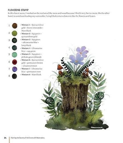 Inside, you'll find step-by-step lessons that make learning watercolor simple and rewarding. Build your skills with guided exercises on color theory, blending, pigment control, layering, and brush handling. Follow easy tutorials to paint forest-themed subjects like mossy logs, butterflies, wildflowers, and other enchanting details of nature. Each project includes full-color examples, mixing tips, and color guides to help you paint with confidence and creativity.