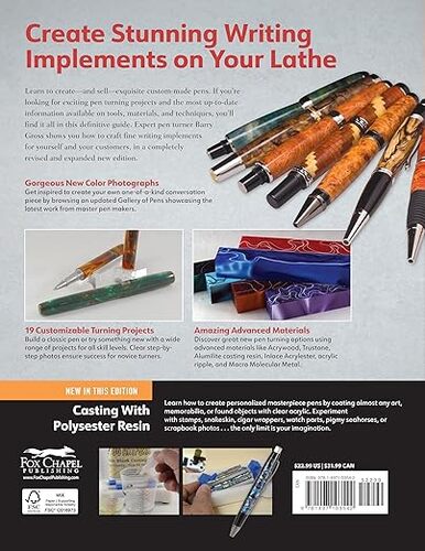 In this revised fourth edition, author and expert pen turner Barry Gross provides insight on pen kits and mechanisms with up-to-date techniques, expanded information on what makes a good pen, selecting materials, and tool maintenance, along with in-depth instruction and creative ideas for both the novice and the experienced turner looking for new ideas. Clear step-by-step photos ensure success even for novice turners.