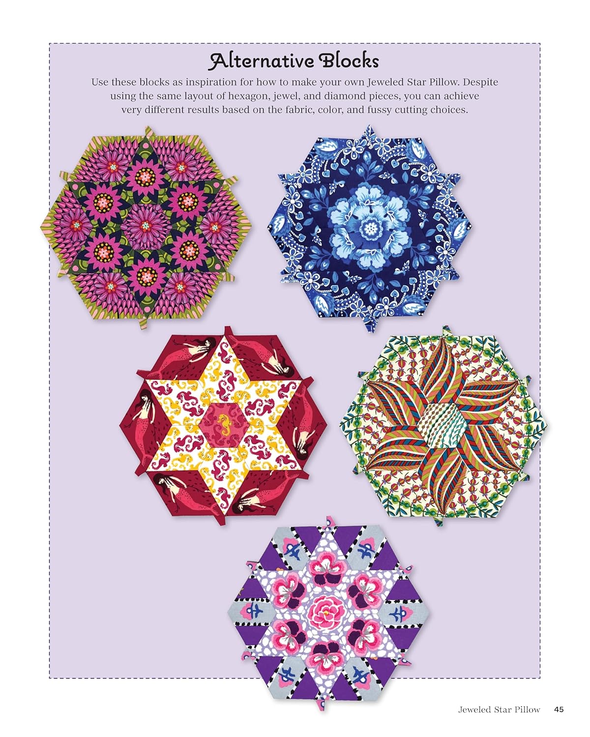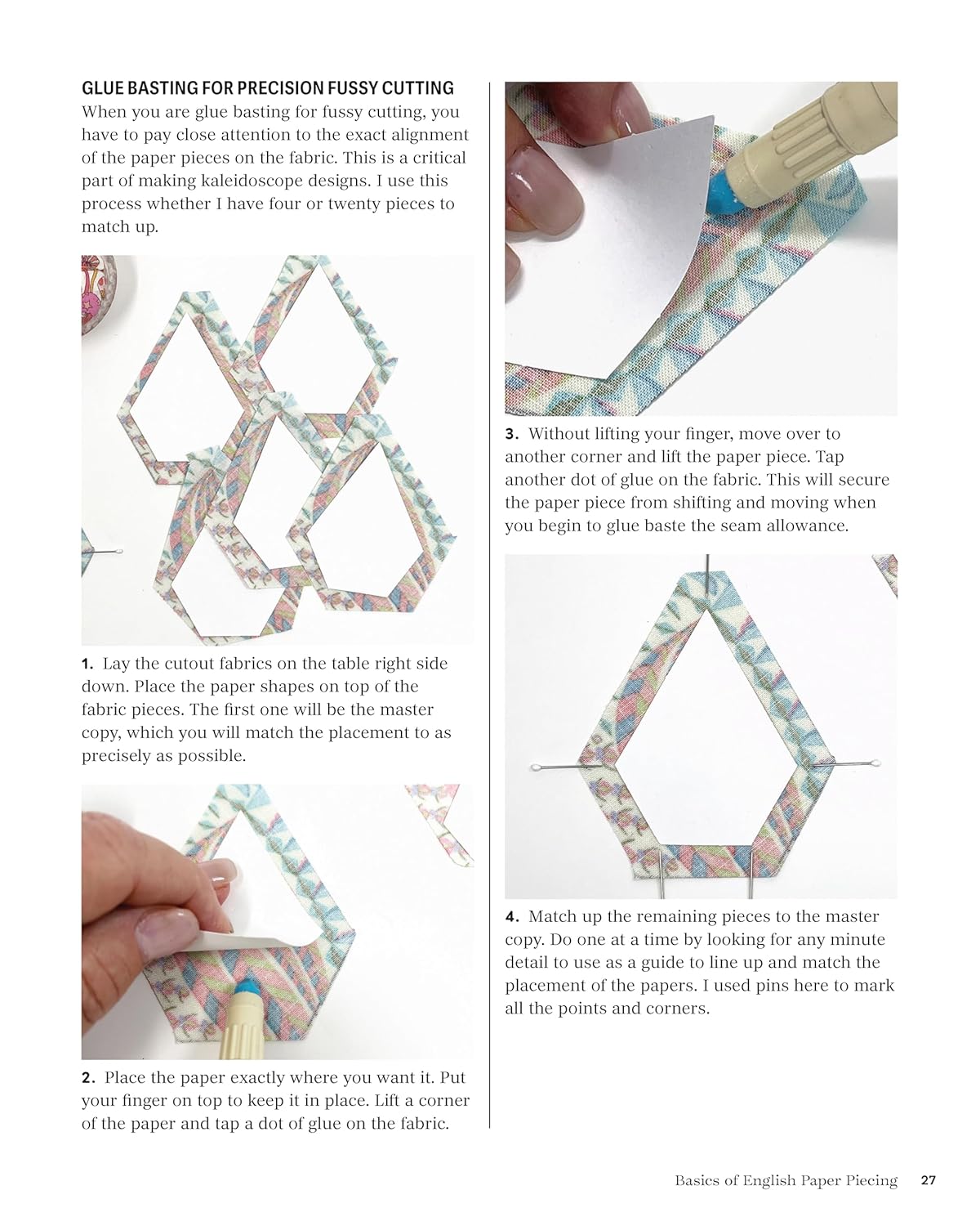 For English Paper Piecing enthusiasts, both seasoned and new, to learn the best way to position templates, how to position identical fussy cut units around a center point to build kaleidoscope blocks, and more