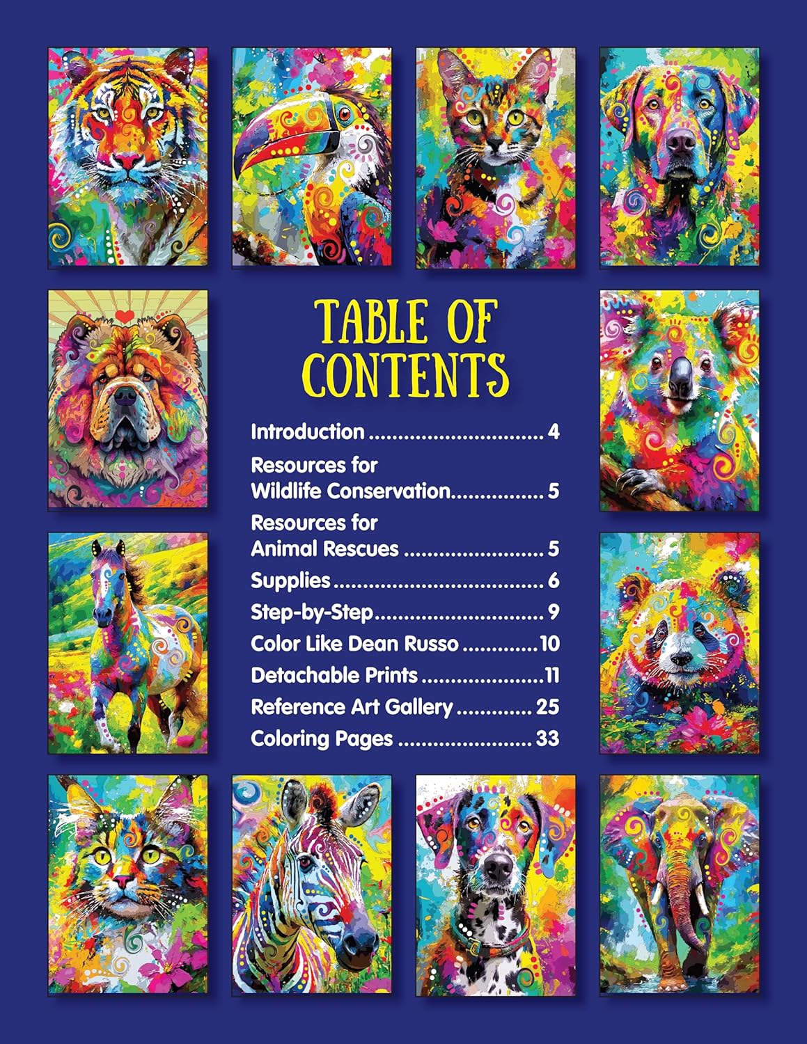 A one-of-a-kind colouring experience from acclaimed pop-artist, Dean Russo. In his first-ever coloring book, Russo creates distinctive black-and-white line art colouring page versions of 30 of his popular animal paintings. Russo's energetic animal paintings trigger an immediate emotional response through his use of vibrant colors and graphic pattern detailing. The 30 colouring page designs include exotic and wildlife animals, fish, dogs, and cats. This unique book also includes 8 stunning Dean Russo prints. Each is printed on perforated high-quality paper, ready for framing and display. For creative inspiration, this book also includes a full-colour photo gallery of the original paintings featured in the book. You'll get a glimpse into Russo's Brooklyn, New York art studio and learn more about his fascinating career and why his animal paintings have become known as "art that loves you back".