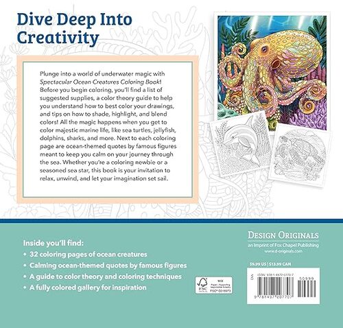 Immerse yourself in the vibrant underwater world with Spectacular Ocean Creatures Coloring Book, a stunning collection of intricate, hand-drawn illustrations featuring fascinating sea animals like jellyfish, sea turtles, dolphins, seahorses, sharks, coral reefs, and more. Whether you're an experienced artist or just beginning your coloring journey, each page offers a relaxing way to explore your creativity while learning fun ocean facts and inspirational quotes along the way.