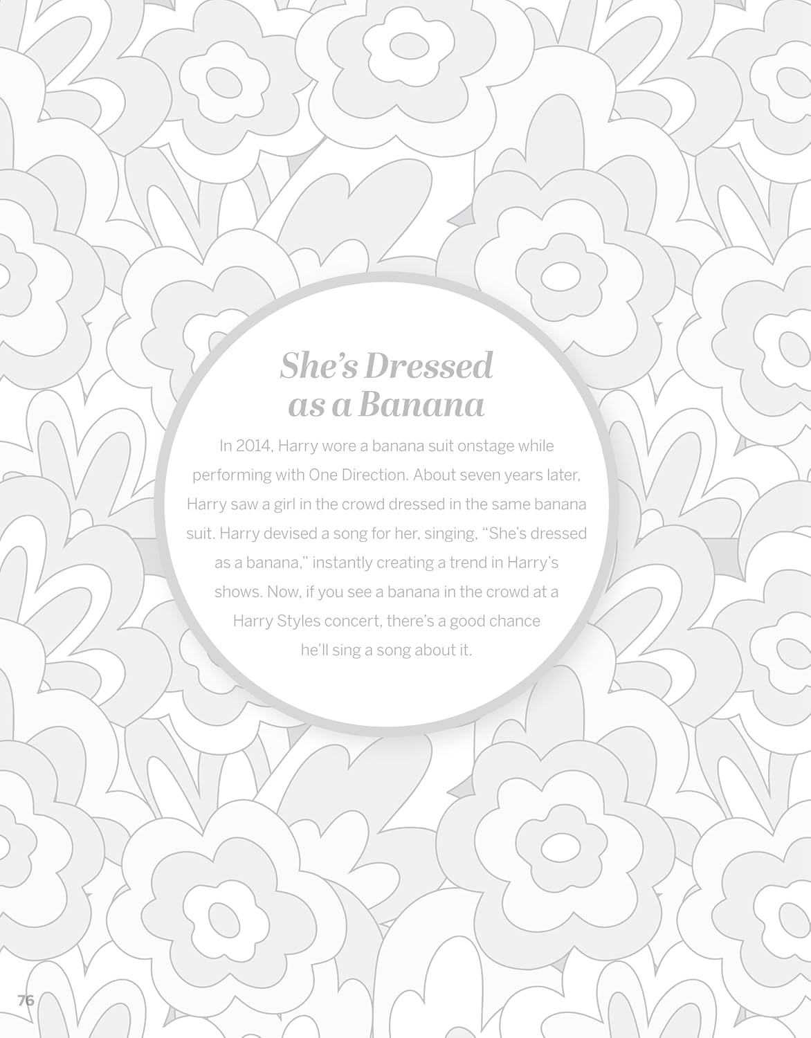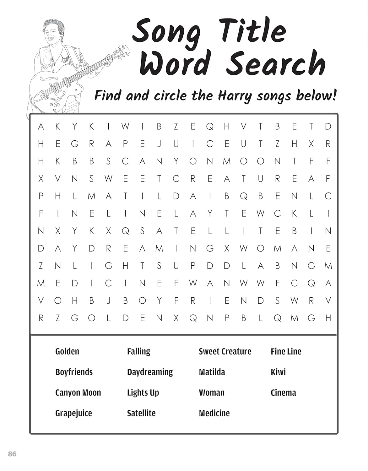 Commemorate Harry's most iconic performances and appearances in 30 amazingly realistic coloring pages. And whether your fandom alliance is with the "Harries" or "Stylers", you are sure to enjoy the challenge of solving a variety of Harry-themed games, puzzles, and quizzes, including spot-the-difference, mazes, and word searches, each inspired by his legendary career.
