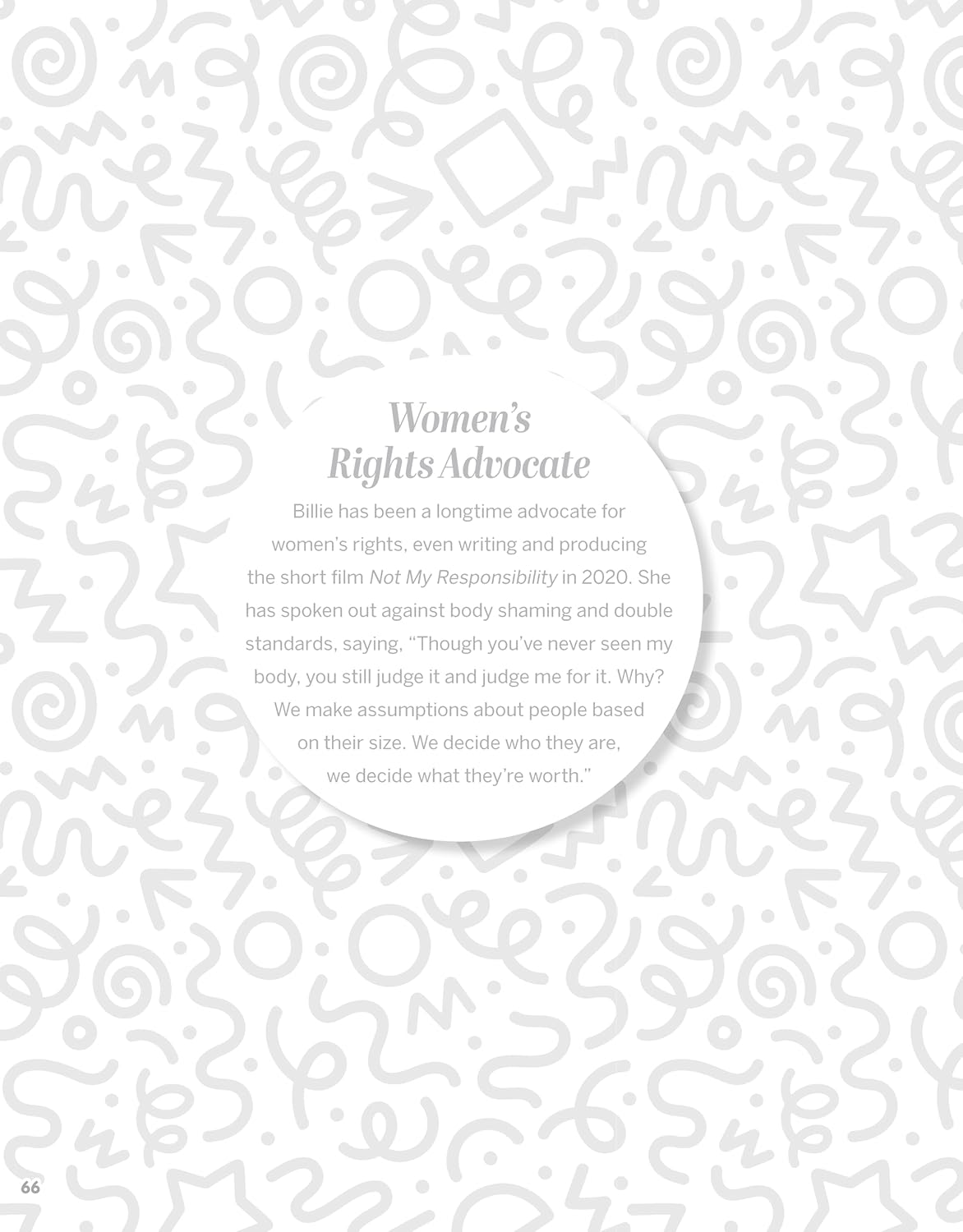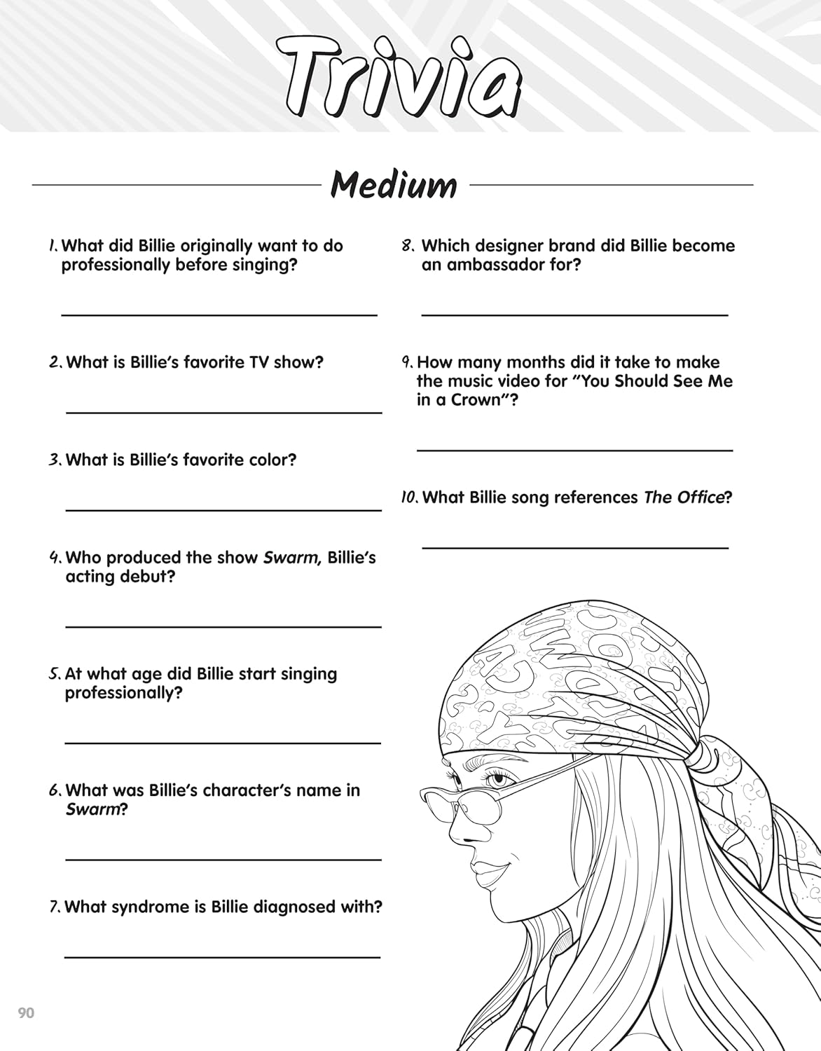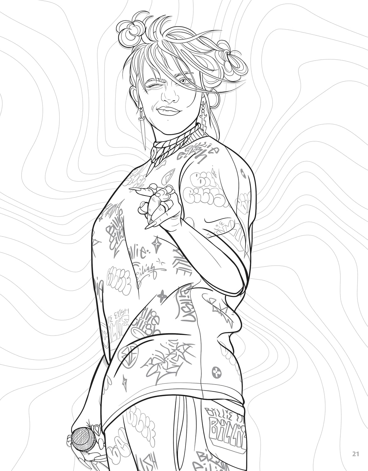 tep into the world of Billie Eilish, one of the most authentic and influential voices of a generation, with this vibrant colouring and activity book. Filled with 32 stunning colouring pages of Billie’s most iconic performances and fashion moments, this book celebrates her unique streetwear-inspired style, from neon hues to oversized silhouettes and bold, graffiti-like designs. Whether you’re colouring Billie on stage, at red carpet events, or in her signature off-duty looks, each page captures her unapologetically bold, creative spirit. Fans will also find a full-colour photo gallery, fun facts, word searches, and crosswords puzzles to test their Billie knowledge. Since making a name for herself in 2015 with the release of her hit single Ocean Eyes, Billie has made history as the youngest person to win a Grammy for album of the year in 2020 and gone on to win many other awards. Her impact on the music industry is undeniable. Whether you're a longtime fan or just discovering Billie’s music, this book is the ultimate way to engage with her artistry. Each colouring page is one sided and perforated for easy removal.