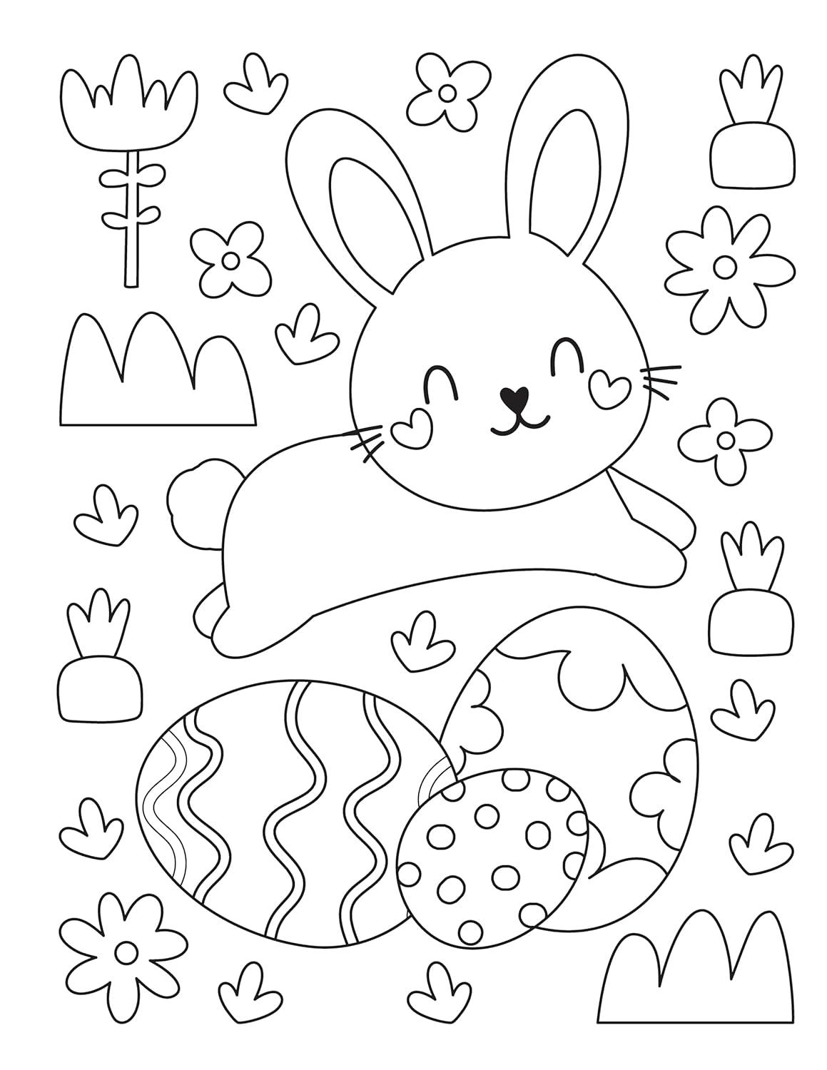 This fun-filled coloring book features 30 sweet Easter-themed line art illustrations for kids to color, including bunnies, chicks, Easter eggs, and so much more!