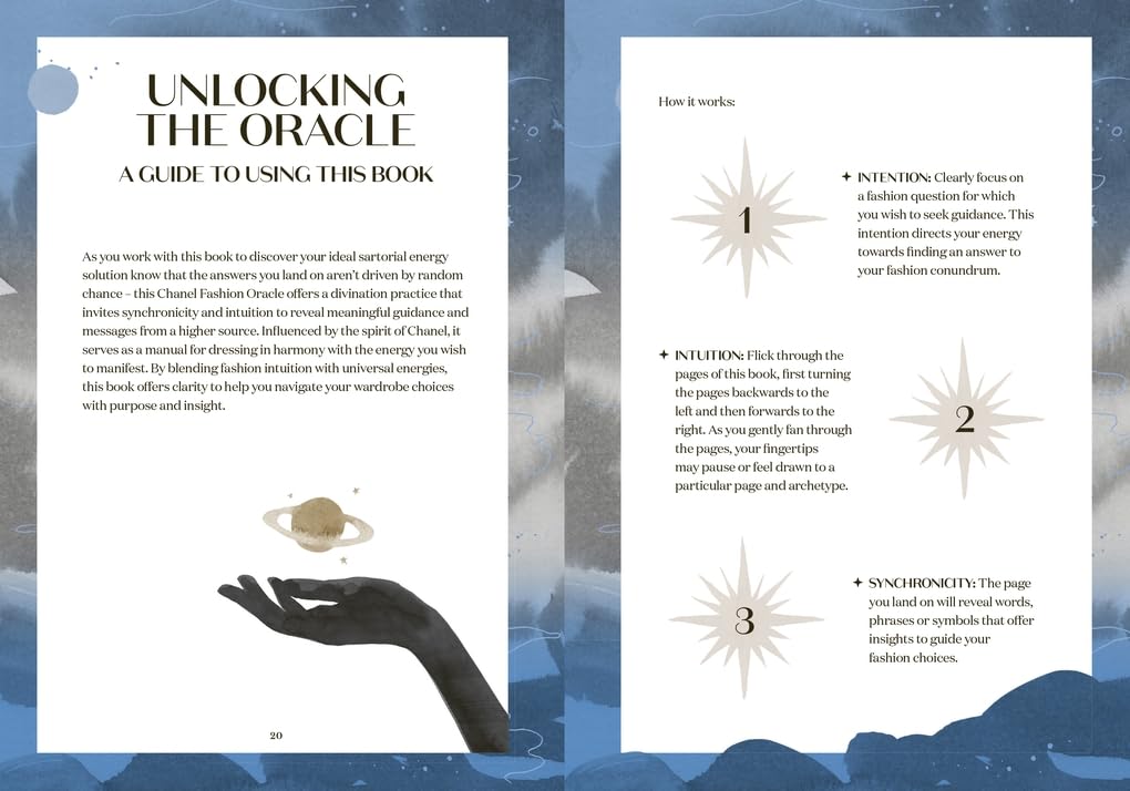 To use the oracle, hold it close to your heart and turn to the left, then turn to the right, while holding your sartorial conundrum in your mind. Open the book and discover the day's style inspiration within.