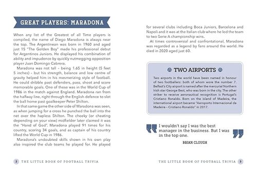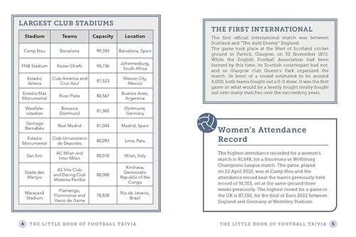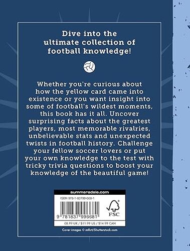 Whether you're curious about how the yellow card came into existence or you want insight into some of football's wildest moments, this book has it all. Uncover surprising facts about the game's greatest players, memorable rivalries, unbelievable stats and unexpected twists in football history. Challenge your fellow soccer lovers or put your own knowledge to the test with tricky trivia questions to boost your knowledge of the beautiful game!