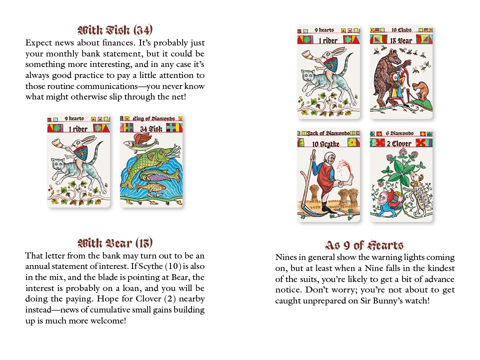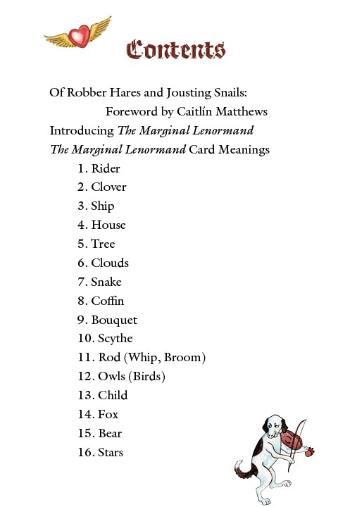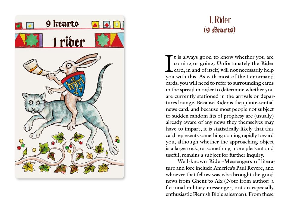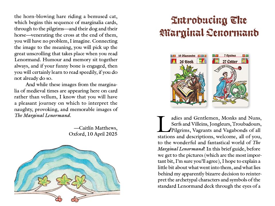 Based on the offbeat imagery of medieval marginalia, The Marginal Lenormand brings traditional Lenormand symbolism to life with anxiety-ridden rabbits, highly suggestive fruit trees, and flowers sprouting from inappropriate places.