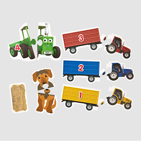 Join Tractor Ted and Midge for their Tedtastic fun bale-throwing game. First make the Tractor Ted, Midge and busy tractor puzzles. Then put them on the floor to play the game. Stand next to Midge and toss the bales on the the tractor's trailers. Either try and get the right number of bales on each one or count the points to see who wins. Lots of fun to play with friends, but equally fun to play on your own. Make the game more challenging by moving Midge further away, and don't forget Tractor Ted is worth the most points so see if you can land a bale in his trailer.