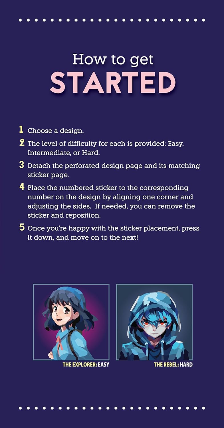 This distinctive poly-art paint-by-sticker book for kids ages 6-10 features a collection of 10 manga designs!