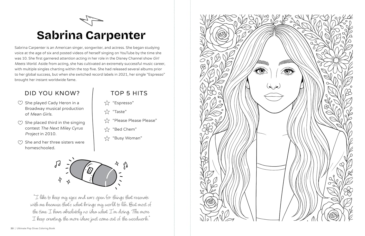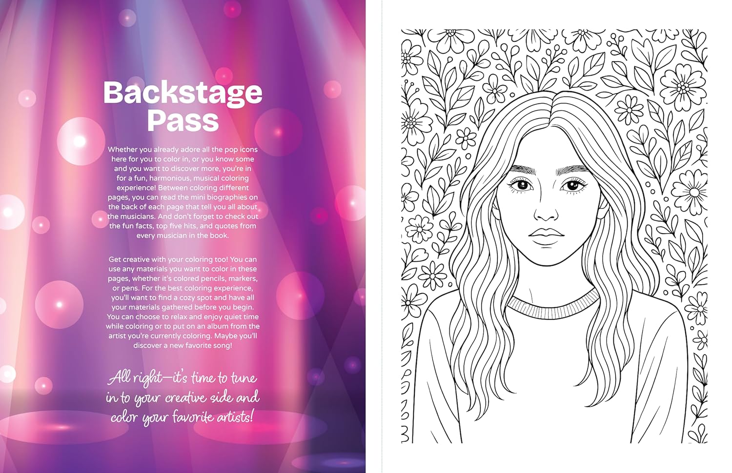 From the iconic style of Madonna and the powerhouse vocals of Beyoncé to Taylor Swift’s ever-evolving eras, this book is packed with the artists who have defined generations. Each beautifully detailed portrait pattern is printed on perforated paper, perfect for displaying your masterpieces. A full-color photo gallery offers creative inspiration, and on the back of every coloring page you’ll find bios, hit songs, and fun facts that give each diva her spotlight—plus a memorable quote from each artist!