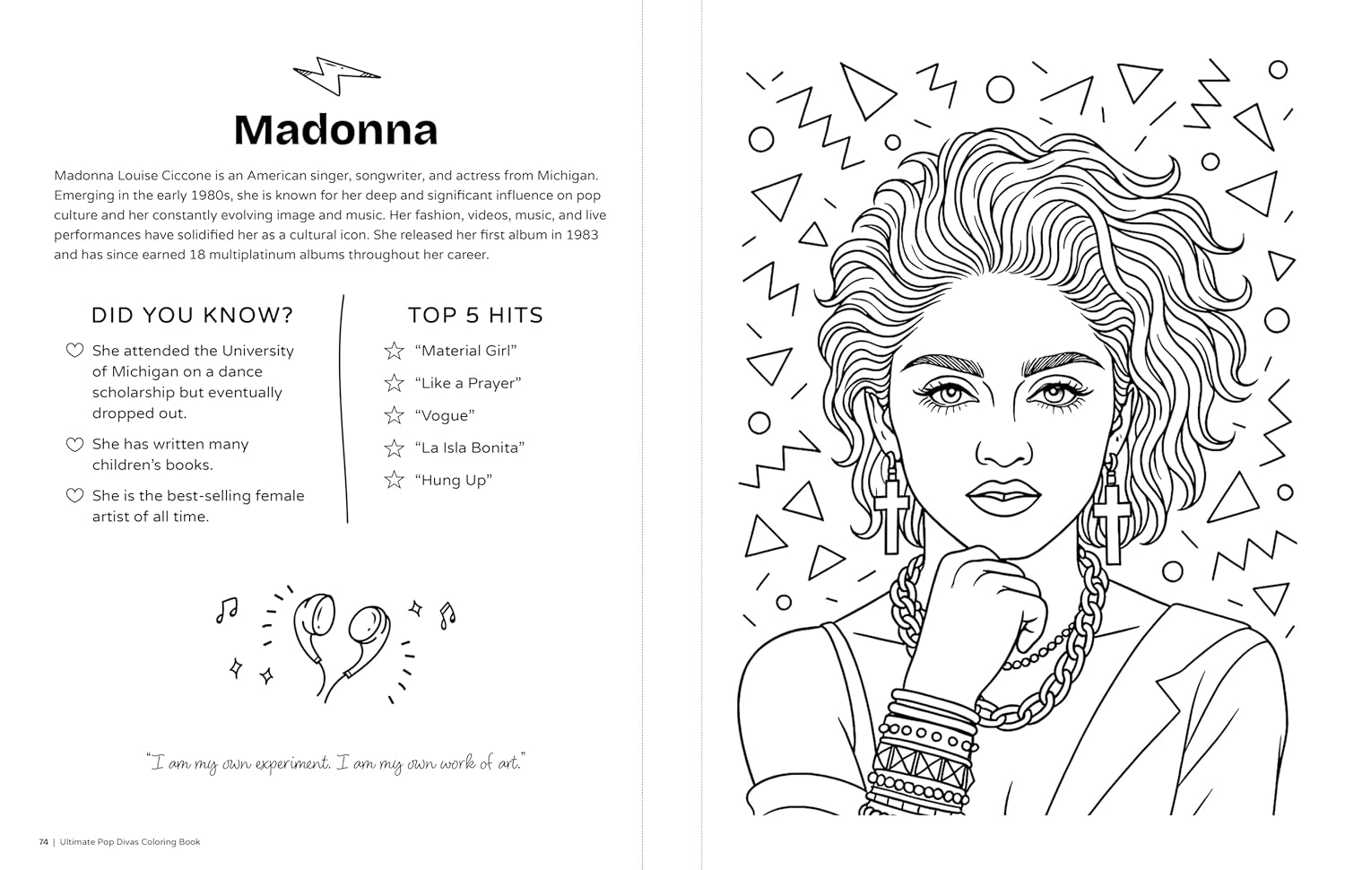 Get ready to color your way through pop history with 40 fierce and fabulous designs celebrating the queens of the stage!