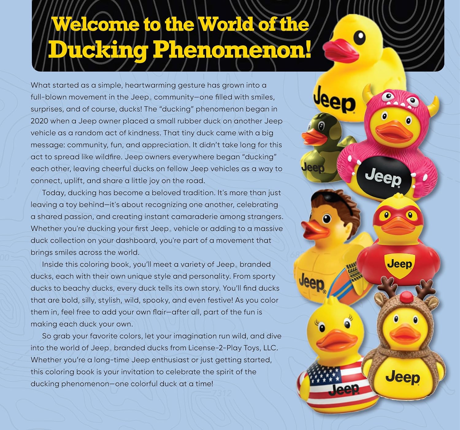 As you color, you'll learn a little about each duck and what makes them unique, like how Camo Duck loves to play hide and seek, and how Floral Duck is always gardening. Also included are stickers of each duck in the book. Every page is perforated, so you can remove it and share it with fellow Jeep enthusiasts.