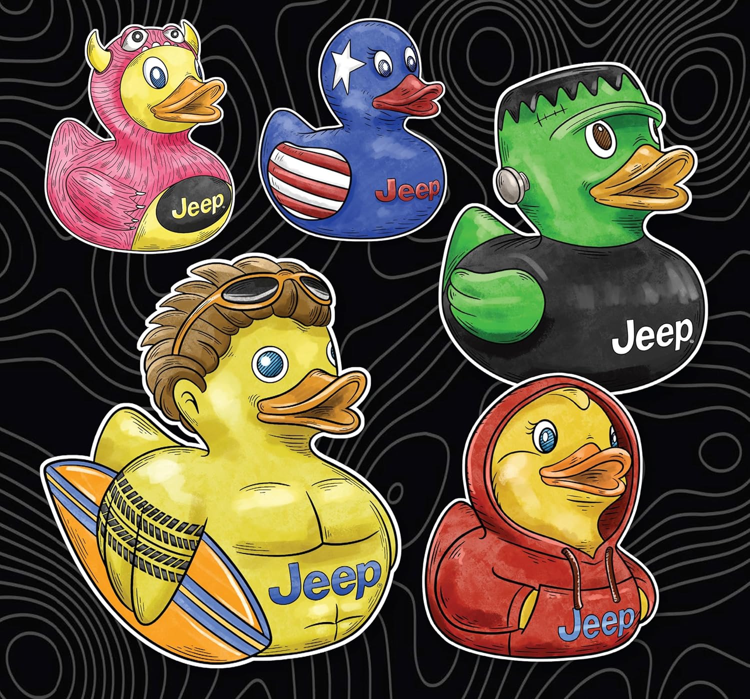 Features real-life duck designs that are collected by Jeep owners, like the Stars and Stripes Duck, Camo Duck, Bigfoot Duck, Biker Duck, and more