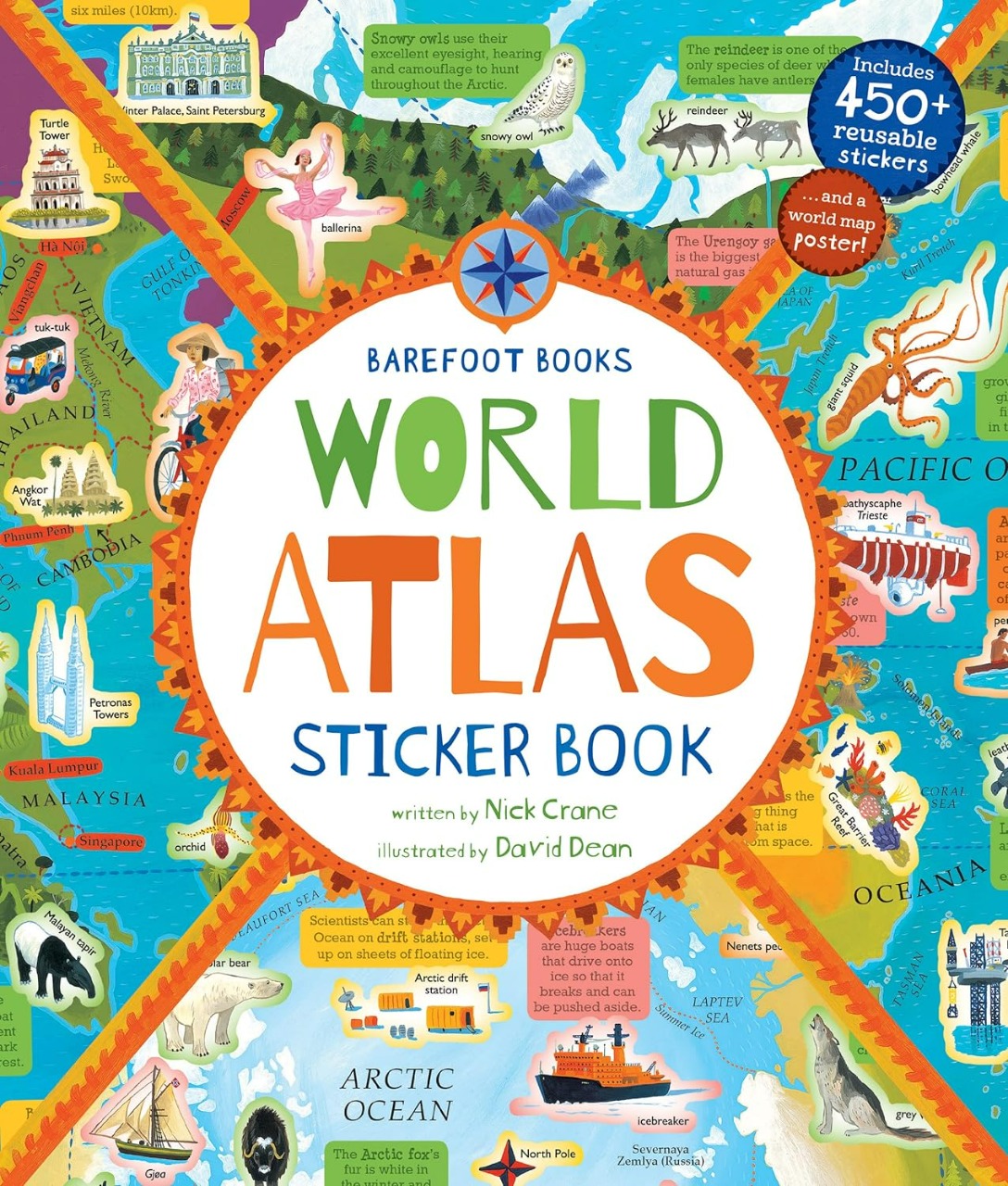 The 450+ reusable stickers in this oversized, 32-page collection guide children on a fact-packed journey around the world, teaching them about each regions people, plants, animals and landmarks. This engaging companion to the celebrated Barefoot Books World Atlas includes a labeled, pull-out world map poster by award-winning artist David Dean.