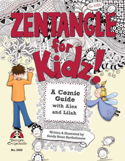 Kids of all ages - get ready to laugh, smile and tangle! Sandy Steen Bartholomew's Zentangle for Kidz! is both a fun romp through pattern play and an inspiring art lesson. Kid characters Alex and Lilah entertain the audience while presenting tangle techniques. They talk to the reader in dialog bubbles, so the book has the inviting style of a comic book. Every page is stuffed with whimsical shapes that grow into awesome designs, but the process is artfully disguised as "messing around with tangles". This book will be especially helpful for anyone who says "I can't draw". Sandy's friendly approach is so inviting, simple and free-form that it will engage even the most timid artist.